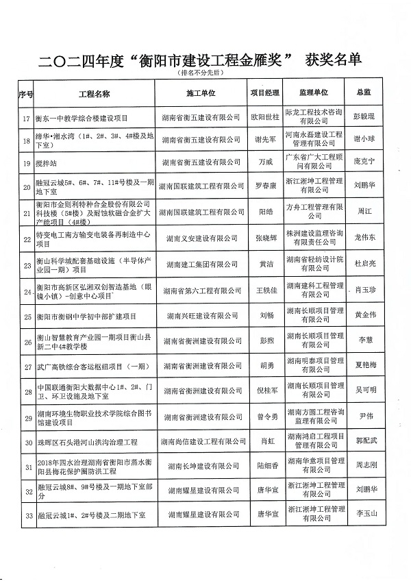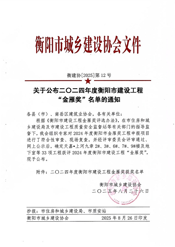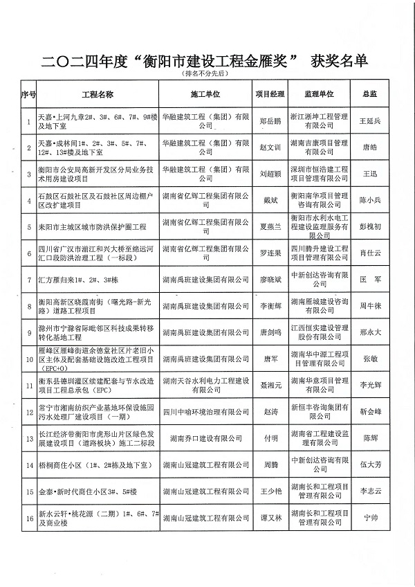 关于公布二〇二四年度衡阳市建设工程“金雁奖”名单的通知